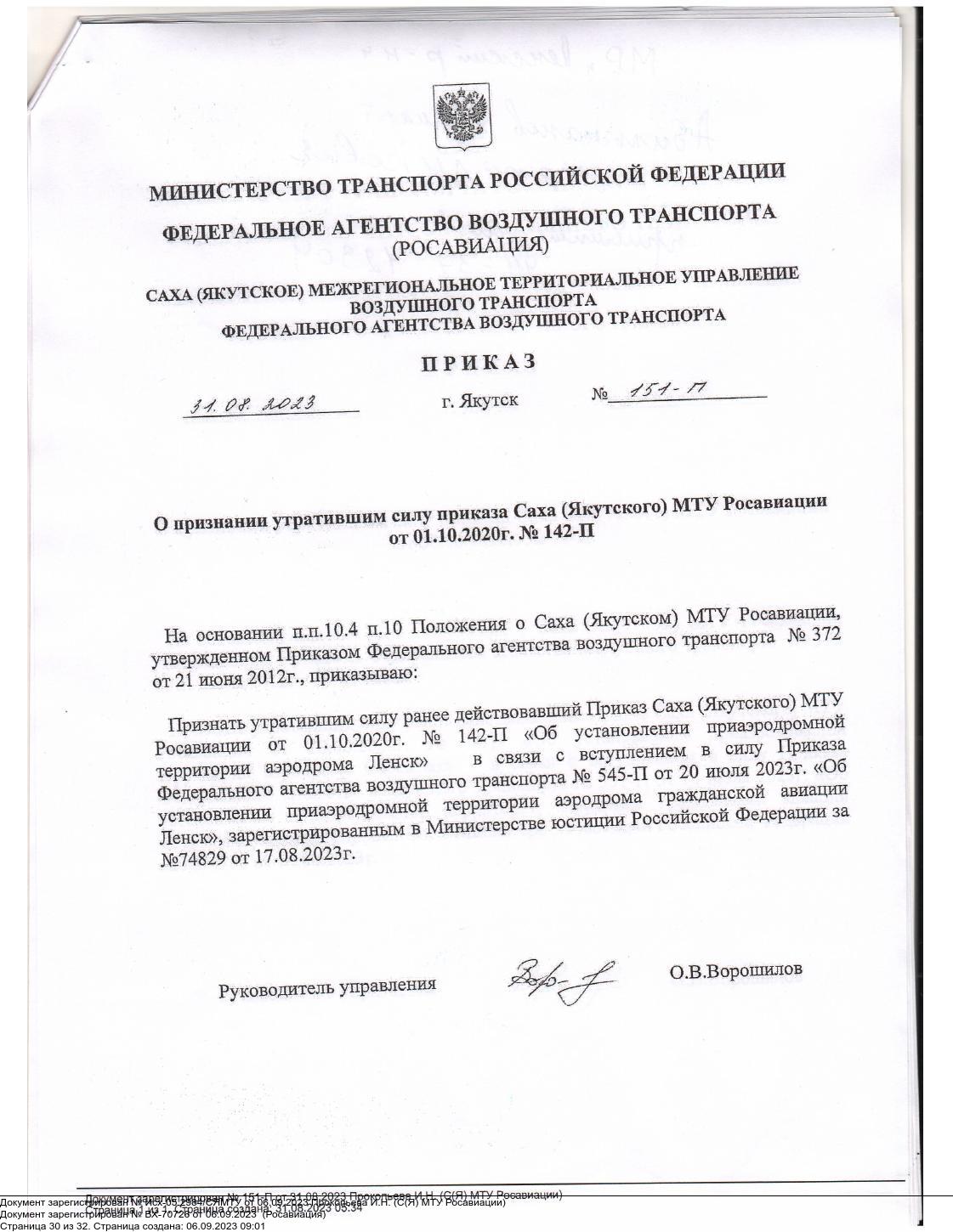 Приказ о признании утратившим силу ранее действовавшего приказа об установлении приаэродромной территории аэродрома гражданской авиации