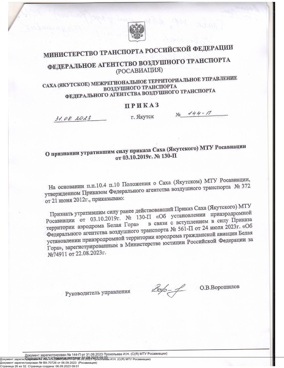 Приказ о признании утратившим силу ранее действовавшего приказа об установлении приаэродромной территории аэродрома гражданской авиации