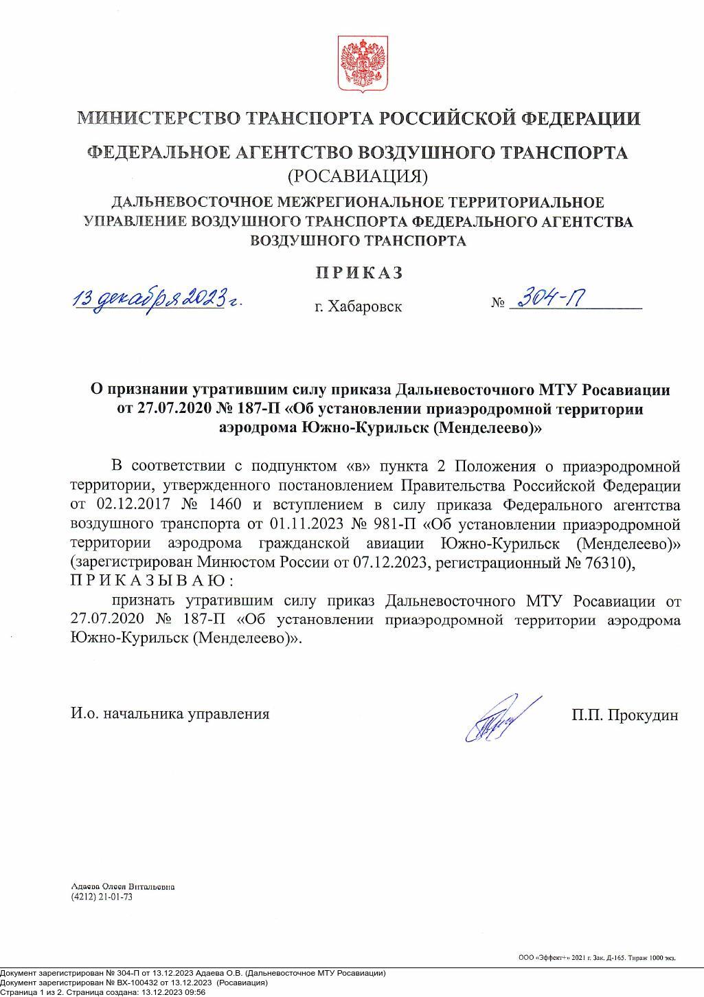 Приказ об установлении приаэродромной территории аэродрома гражданской авиации Южно-Курильск (Менделеево)