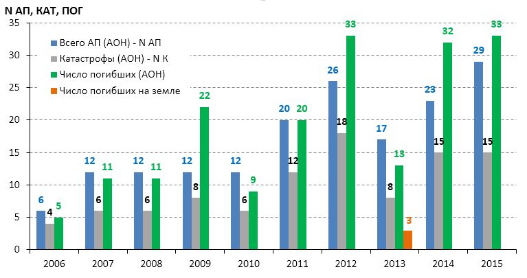 § в 2015 году Росавиацией было зафиксировано 17 авиационных происшествий, в том числе 11 катастроф (с гибелью 15 человек), с воздушными судами, владельцы (эксплуатанты) которых в нарушение требований Воздушного кодекса Российской Федерации не прошли процедуры государственной регистрации воздушного судна и получения необходимых разрешений на право выполнения полетов. Соотношение числа авиационных происшествий с зарегистрированными воздушными судами АОН и незарегистрированными воздушными судами составляет почти 2:1.