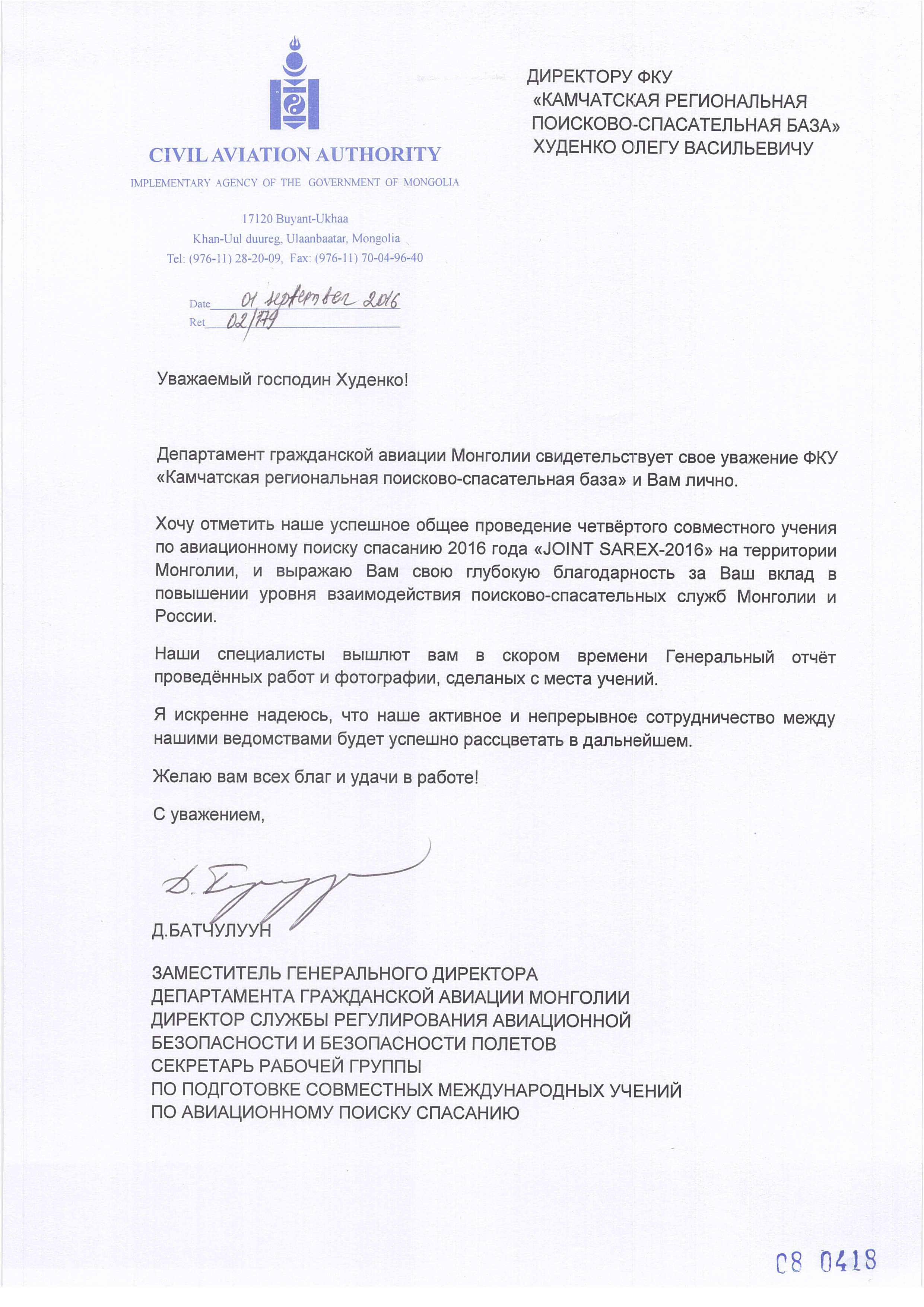 Департамент гражданской авиации Монголии выразил российской стороне благодарность за вклад в повышение уровня взаимодействия поисково-спасательных служб Монголии и России и успешное проведение четвёртого совместного учения по авиационному поиску спасанию 2016 года «JOINT SAREX-2016»
