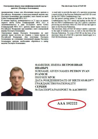 De acuerdo con la legislación vigente de la Federación Rusa (Ley Federal №108-LF del 07.06.2013 «Sobre la preparación y celebración en la Federación Rusa del Campeonato Mundial de Fútbol de la FIFA 2018, la Copa FIFA Confederaciones 2017 y las modificaciones realizadas en algunas actas legislativas de la Federación Rusa), la Tarjeta Personificada del Espectador/Pasaporte de Aficionado/FAN ID permite la entrada sin visado al territorio de la Federación Rusa, utilizando sólo el documento de identidad vigente, reconocido por la Federación Rusa para tales efectos.