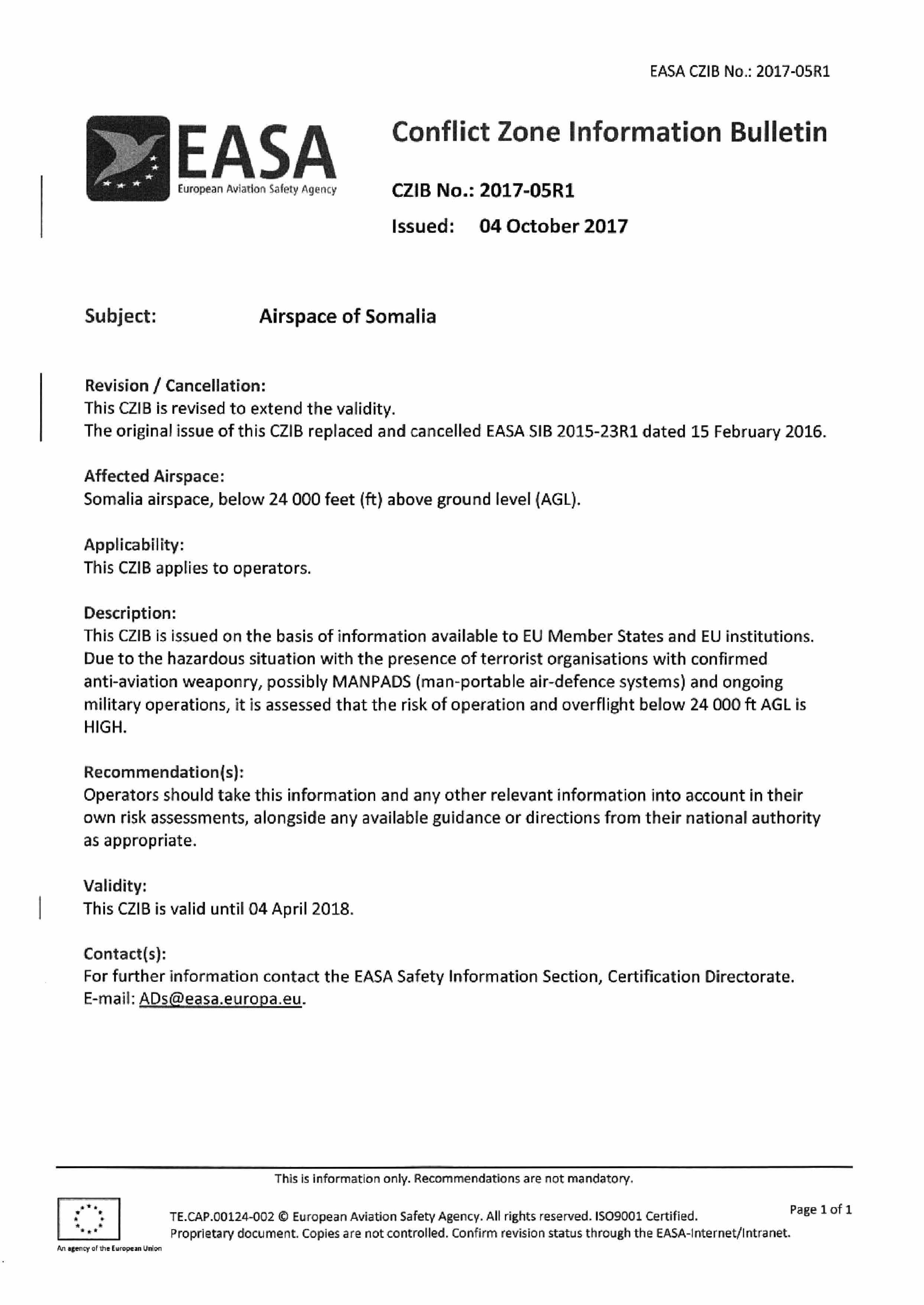 О существующих рисках для гражданских воздушных судов российских авиакомпаний в воздушном пространстве Федеративной Республики Сомали, в связи с наличием террористических организаций и продолжающимися интенсивными военными операциями