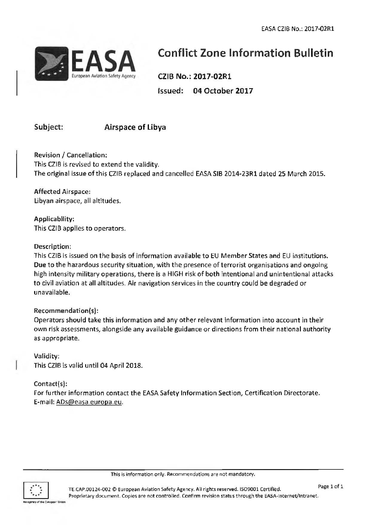 О существующих рисках для гражданских воздушных судов российских авиакомпаний в воздушном пространстве Государства Ливии, в связи с наличием террористических организаций и продолжающимися интенсивными военными операциями