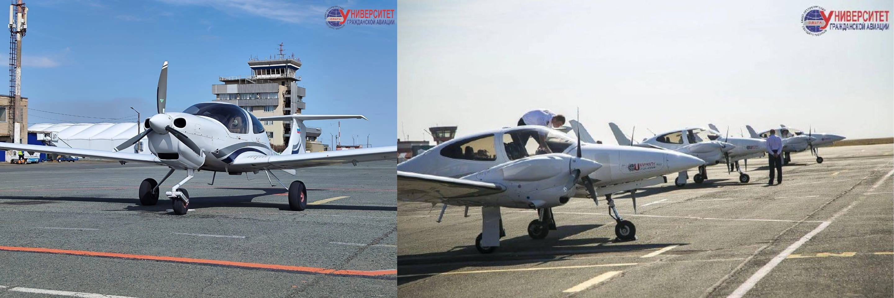 Учебные самолеты СПбГУ ГА: однодвигательный самолет Diamond DA 40NG (слева) и двухдвигательные самолет Diamond DA 42NG (справа)