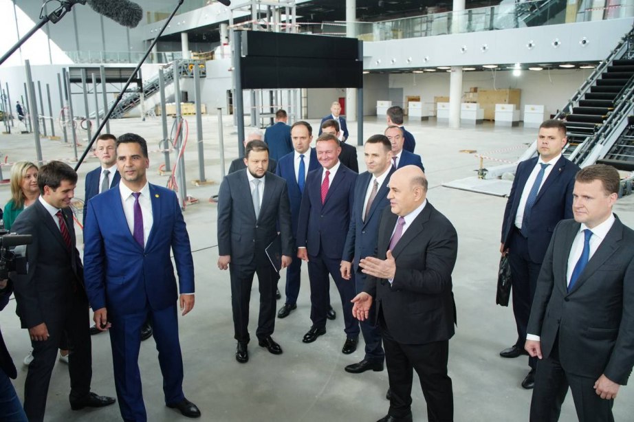 Михаил Мишустин в строящемся терминале международных авиалиний аэропорта Хабаровск с министром транспорта Романом Старовойтом и руководителем Росавиации Дмитрием Ядровым