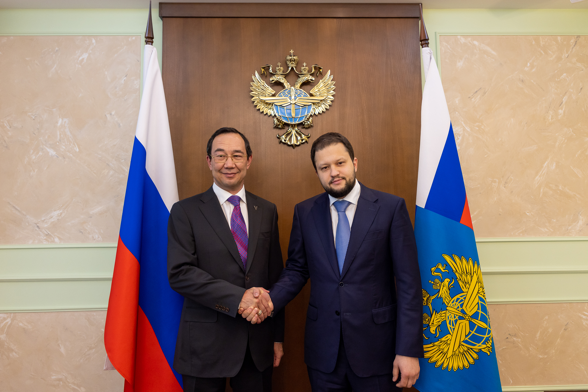 Глава Росавиации Дмитрий Ядров и глава Якутии Айсен Николаев на встрече в Москве