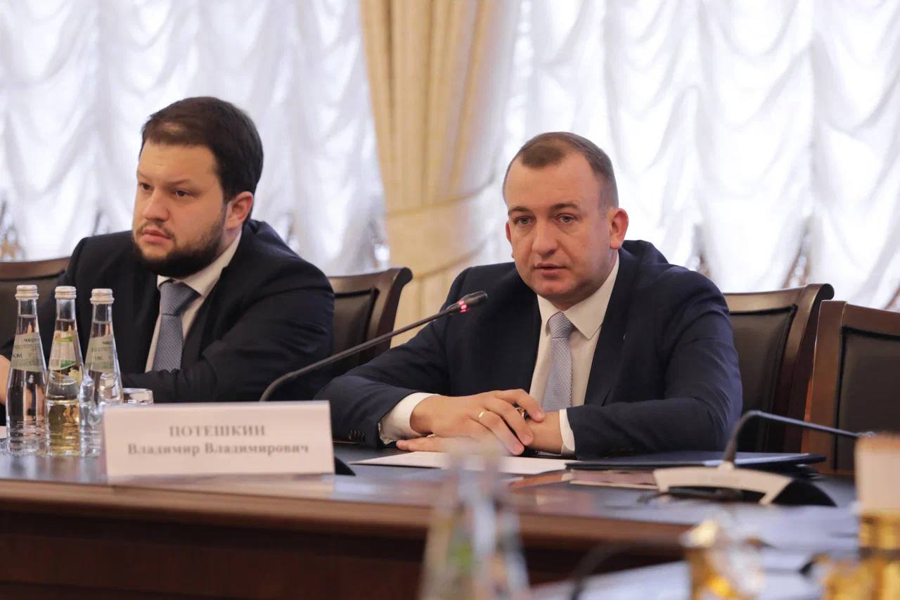 Глава Росавиации Дмитрий Ядров (слева) и заместитель министра транспорта Владимир Потешкин (справа) на рабочем совещании