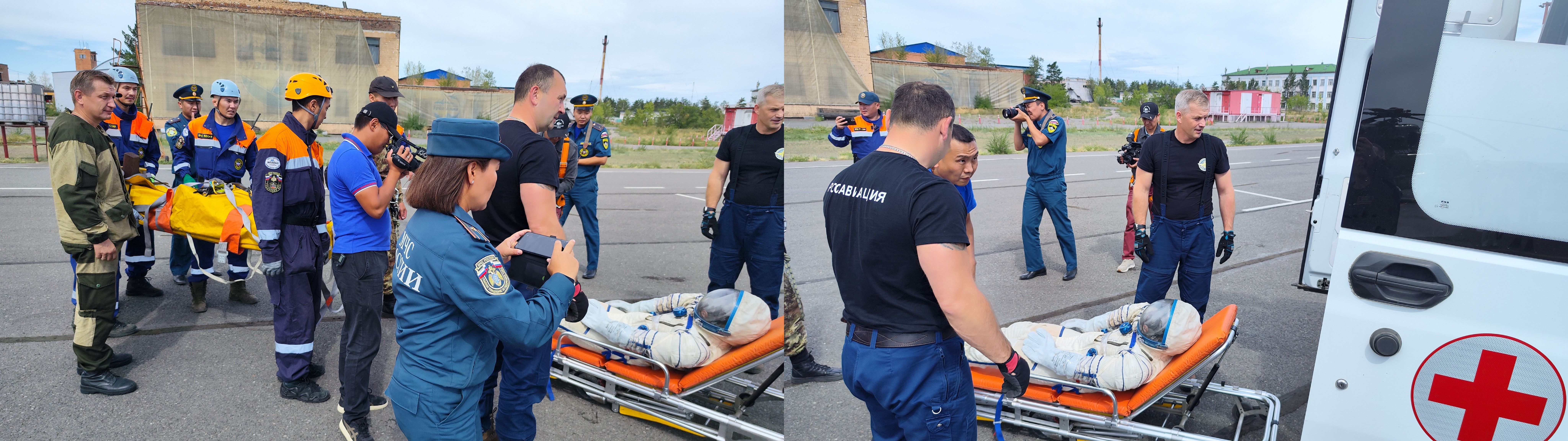 Специалисты во время комплексных совместных учений по эвакуации космонавтов и оказанию медицинской помощи