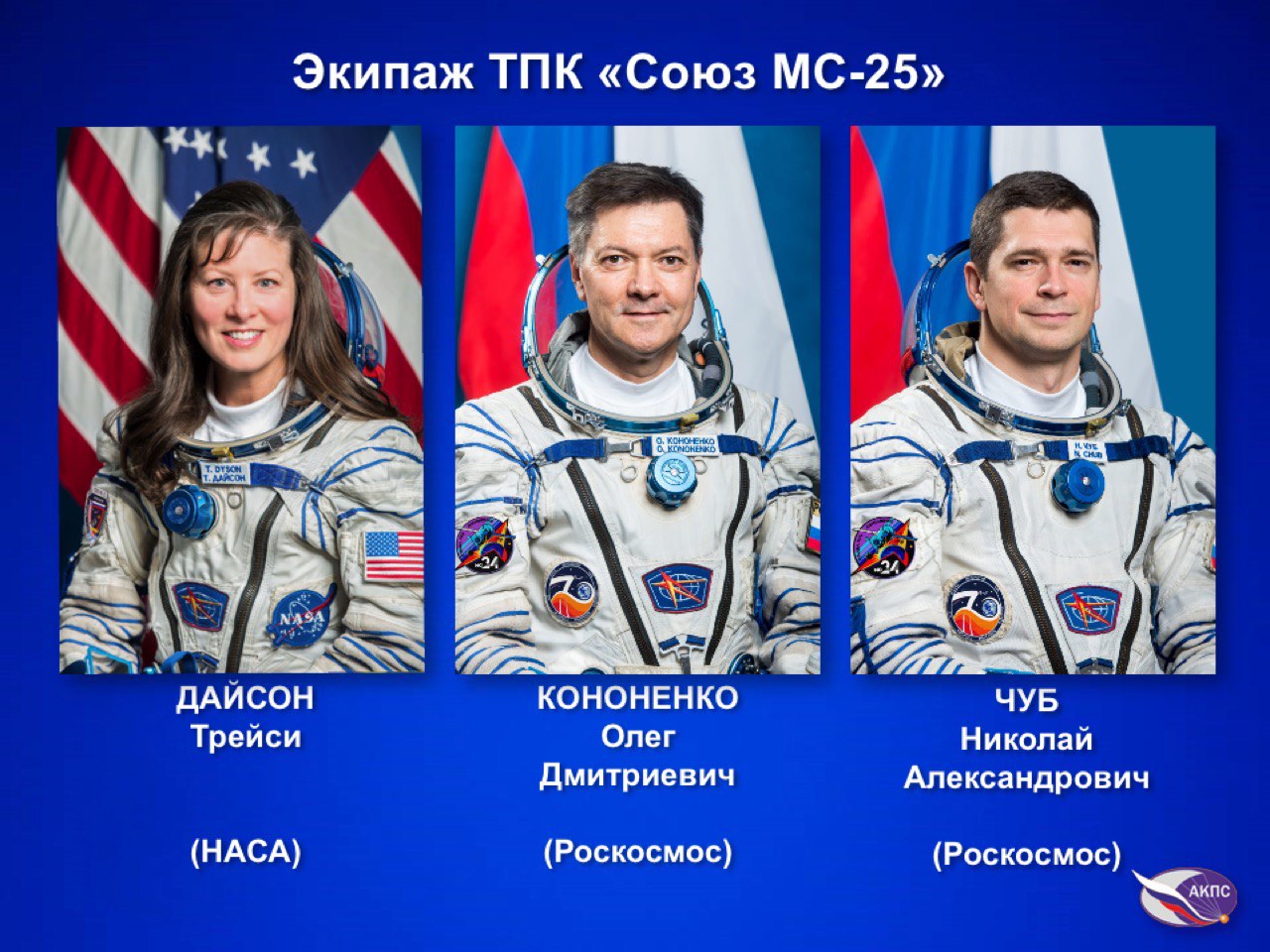 В СА ТПК «Союз МС-25» на Землю вернутся российские космонавты Олег Кононенко и Николай Чуб, американская астронавт Трейси Дайсон.
