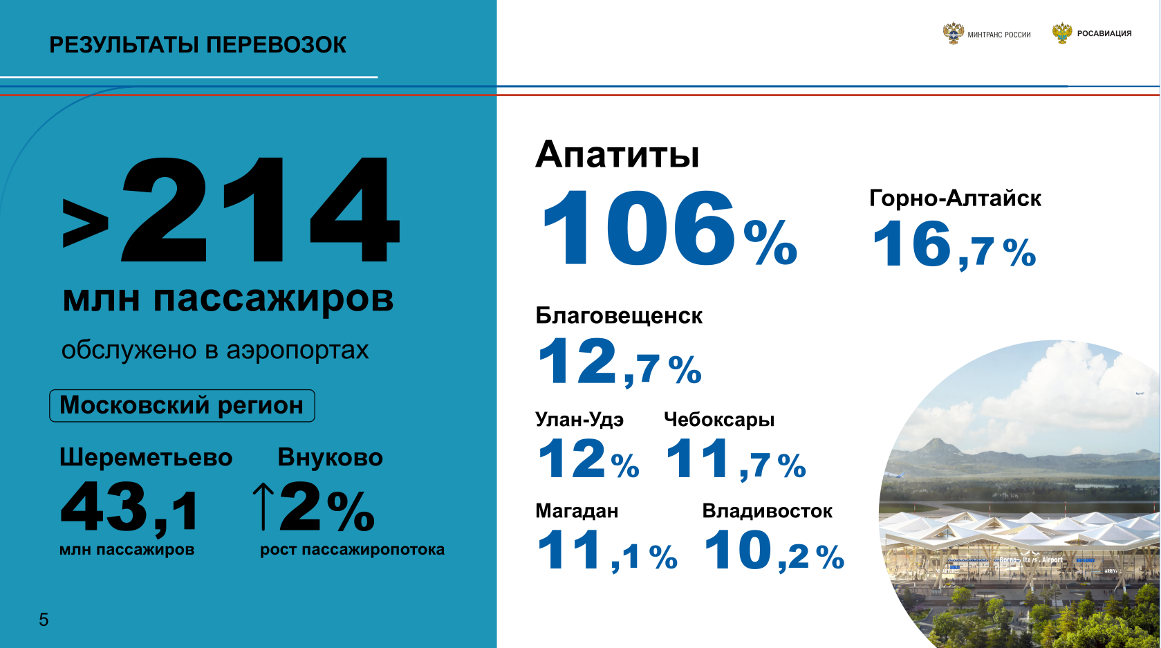Результаты работы агентства за прошедший год и основные задачи на предстоящий период представил руководитель Росавиации Дмитрий Ядров. Итоговые показатели выполненных авиаперевозок, 108,85 млн пассажиров у отечественных авиакомпаний и более 214 млн – у аэропортов России, отражают работу отрасли на высоких оборотах, отметил глава агентства. В условиях санкций опережающие темпы роста на международных линиях напрямую связаны с работой Минтранса и Росавиации с авиавластями заинтересованных стран и представительств.