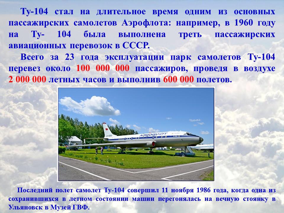 Наш Ту-104 после выполнения первого регулярного пассажирского рейса бесперебойно эксплуатировался 23 года (до 1979 года). Был изготовлен 201 самолет разных модификаций. Он перевез более 10 млн. пассажиров, провел в воздухе 2 млн. часов, выполнил 600 тыс. полетов.