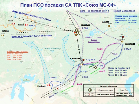 По результатам проведенного специалистами Росавиации облета расчетных точек посадки спускаемого аппарата пригодным для проведения поисково-спасательных работ определен район, расположенный в 145 км юго-восточнее от г. Жезказган, Республика Казахстан.