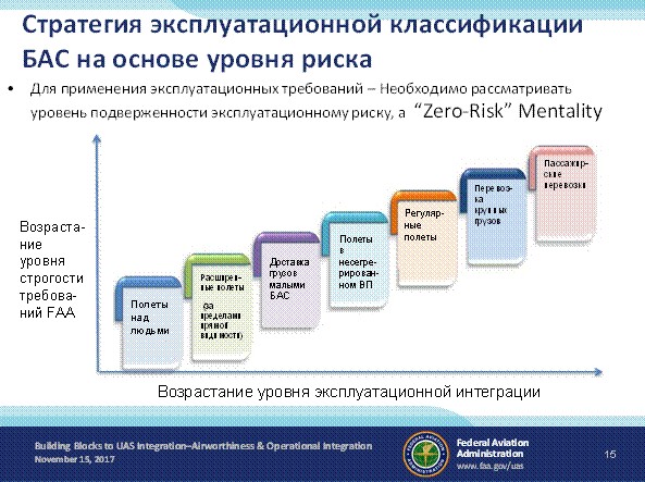 По вопросу планирования интеграции БАС, стратегия и подходы представитель ФАА США (П. Стейси) в своем выступлении озвучила путь, которым идет ФАА к интеграции полетов БАС в национальное воздушное пространство (NAS) для всех эксплуатантов БАС. Интеграция БАС будет осуществляться путем внедрения полной нормативно-правовой базы на основе рисков.