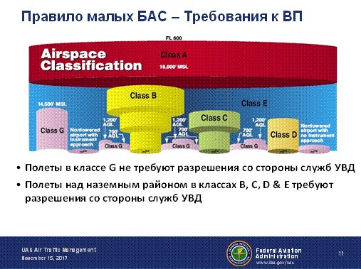 Правило допускает полеты БАС в неконтролируемом (класс G) ВП без разрешения со стороны УВД. Полеты в контролируемом ВП (Классы B, C, D, и E) требуют разрешения УВД.