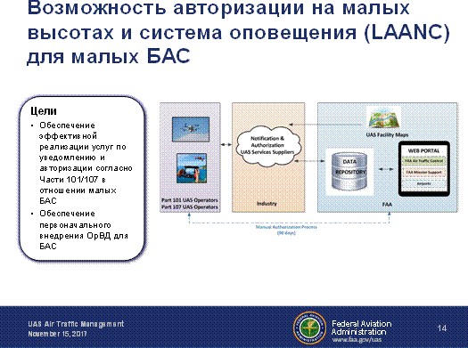 Следующим шагом (с ноября 2017 года) в автоматизации обработки запросов является разработка и внедрение ФАА так называемой LAANC – системы автоматической обработки запросов разрешений на полеты малых БАС на малых высотах в соответствии с частью 107.