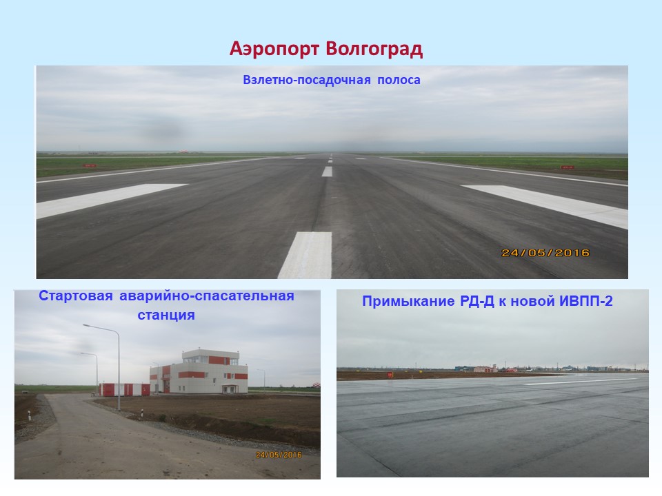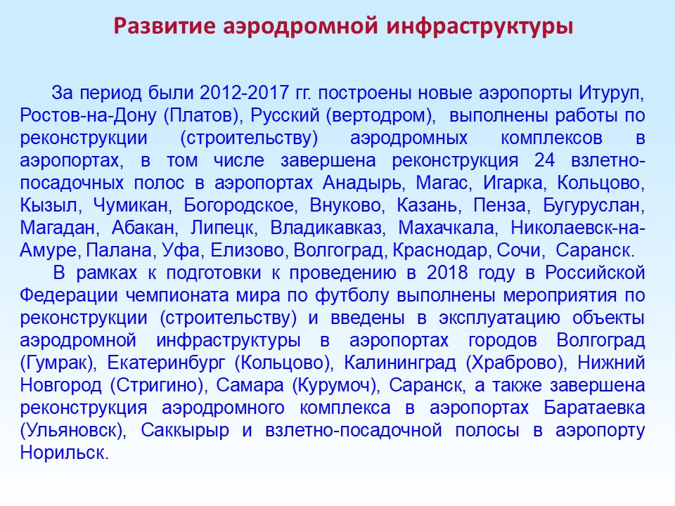 В рамках к подготовки к проведению в 2018 году в Российской Федерации чемпионата мира по футболу построен новоый аэропорт в г. Ростове-на-Дону, выполнены мероприятия по реконструкции (строительству) и введены в эксплуатацию объекты аэродромной инфраструктуры в аэропортах городов Волгоград (Гумрак), Екатеринбург (Кольцово), Калининград (Храброво), Нижний Новгород (Стригино), Самара (Курумоч), Саранск, а также завершена реконструкция аэродромного комплекса в аэропортах Баратаевка (Ульяновск), Саккырыр и взлетно-посадочной полосы в аэропорту Норильск.