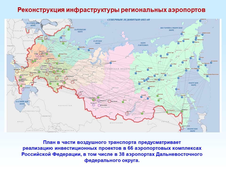 Федеральным проектом «Развитие инфраструктуры региональных и местных аэропортов» Комплексного плана модернизации и расширения магистральной инфраструктуры на период до 2024 года, утвержденного распоряжением Правительства Российской Федерации от 30.09.2018 № 2101-р, предусматривается дополнительное финансирование из средств федерального бюджета на реализацию мероприятий по реконструкции аэродромной инфраструктуры в 66 аэропортах на территории Российской Федерации, в том числе в 38 аэропортах Дальневосточного федерального округа.