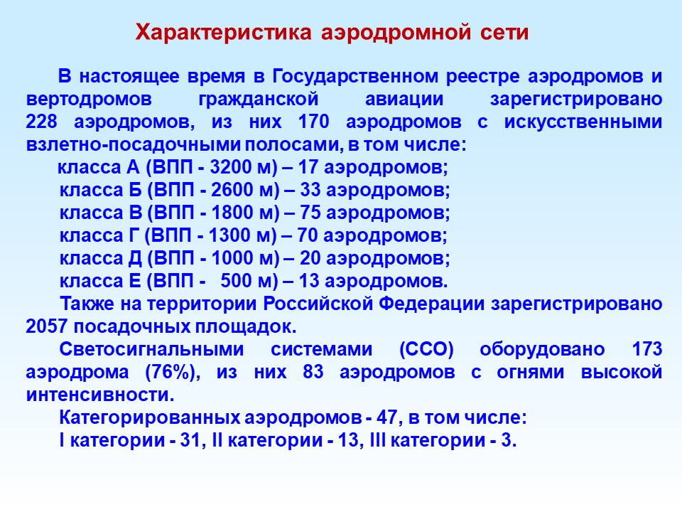 В настоящее время в Государственном реестре аэродромов и вертодромов гражданской авиации зарегистрировано 228 аэродромов, из них 170 аэродромов с искусственными взлетно-посадочными полосами, в том числе: