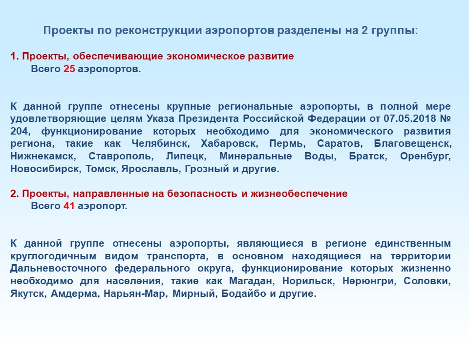 1. В проекты, обеспечивающие экономическое развитие, включены 25 аэропортов.