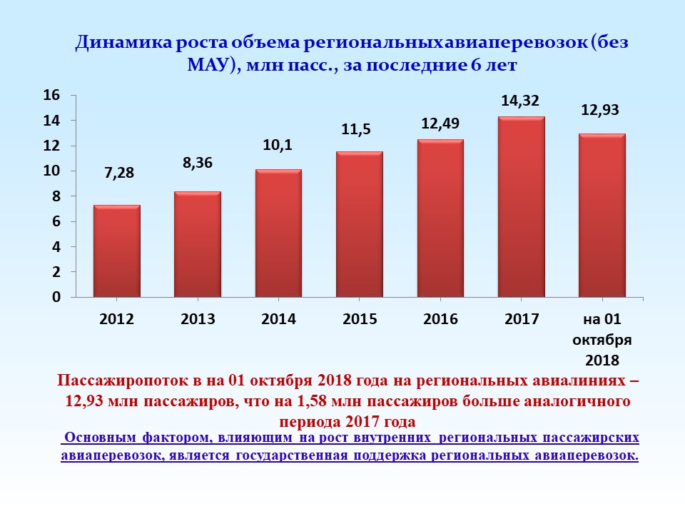 Одной из причин роста объема перевозок на внутренних линиях являются меры государственной поддержки региональных авиаперевозок, которые направлены на обеспечение транспортной доступности регионов (развитие авиационной инфраструктуры и региональных воздушных перевозок).