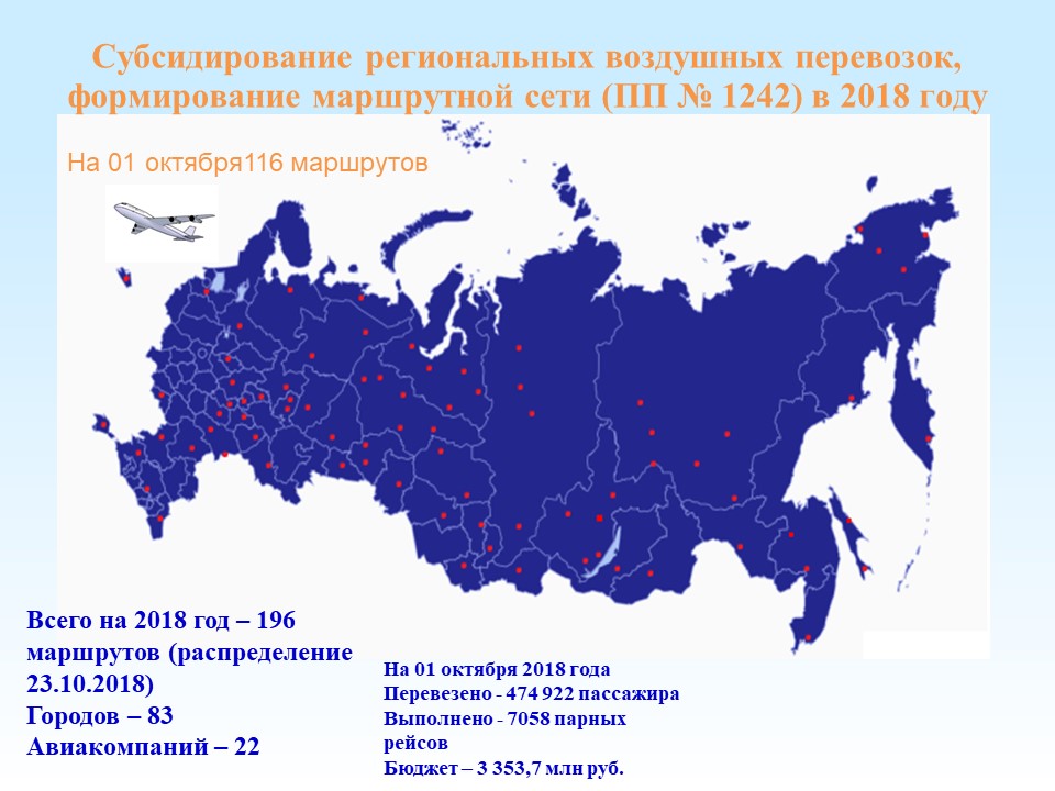 В перечень субсидируемых маршрутов включены 116 маршрутов, из них 63 софинансируемых. Полеты выполняются 22 авиакомпаниями.