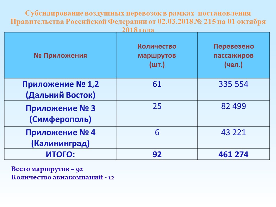 2. Программа представления субсидий из федерального бюджета организациям воздушного транспорта в целях обеспечения доступности воздушных перевозок населению (постановление Правительства Российской Федерации от 02.03.2018 № 215). В рамках указанной программы субсидируемые перевозки осуществляются из Дальнего востока и обратном направлении (Приложение №1,2), в г. Симферополь и в обратном направлении и из г. Калининграда и в обратном направлении. На реализацию программы выделено 3,8 млрд рублей.