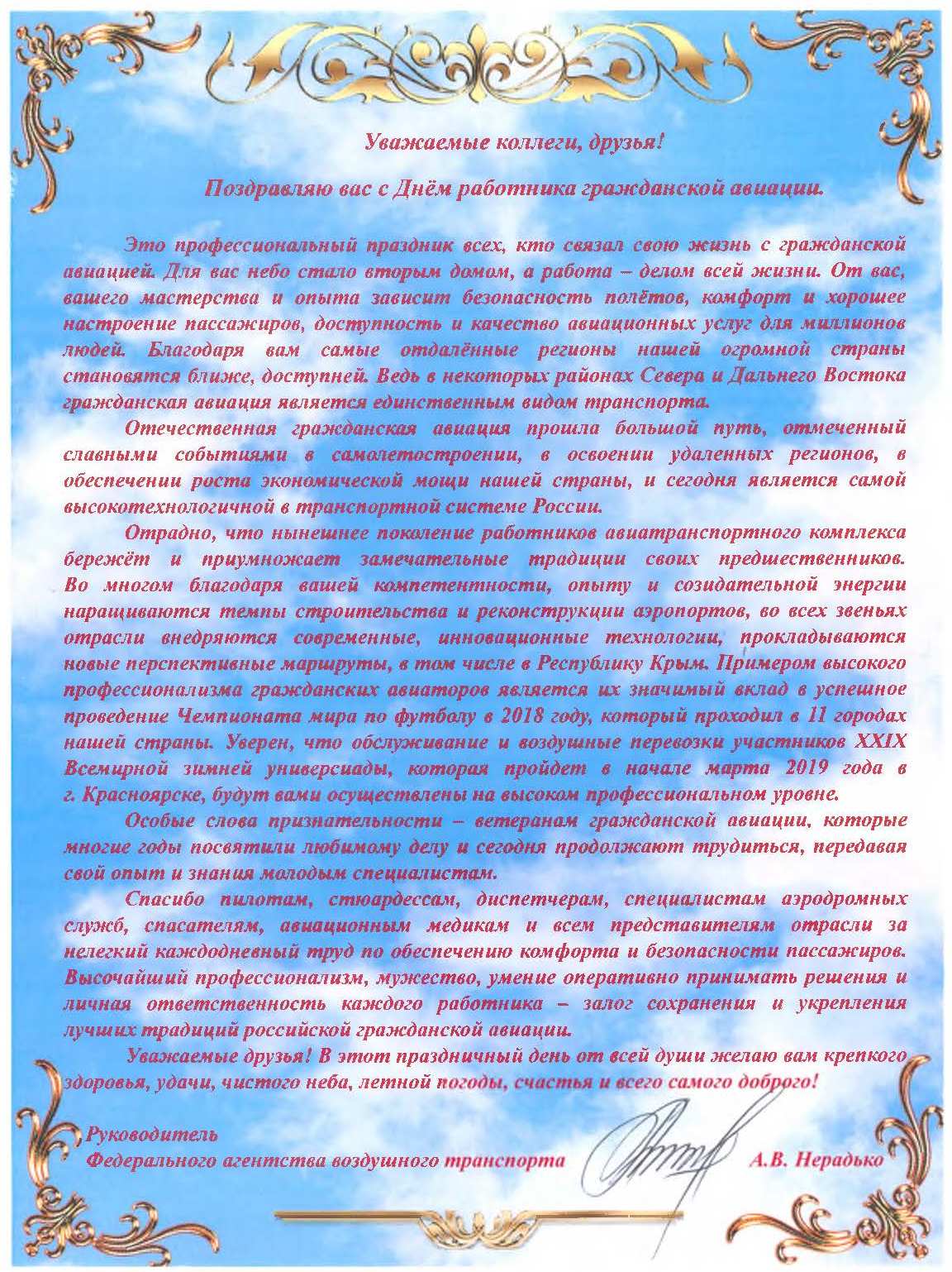 Поздравление руководителя Росавиации Александра Нерадько с Днём работника гражданской авиации
