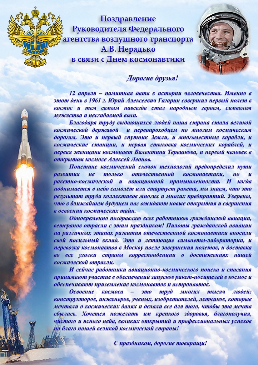 Поздравление Руководителя Федерального агентства воздушного транспорта А.В. Нерадько в связи с Днем космонавтики