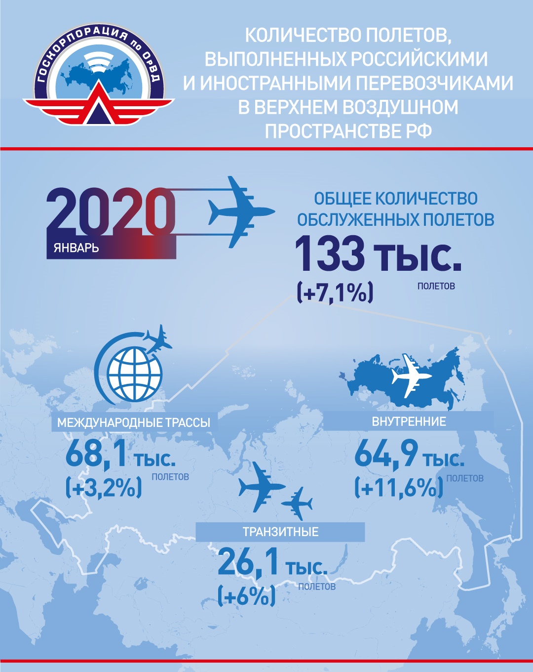 В январе 2020 года российские авиадиспетчеры обслужили в верхнем воздушном пространстве страны 133 тыс. полётов, увеличив этот показатель относительно того же периода прошлого года на 7,1 %.На международных воздушных линиях выполнено 68,1 тыс. полётов, рост + 3,2%, включая 26,1 тыс. транзитных полётов, рост +6 %. Число внутренних полётов составило 64,9 тыс., рост +11,6%.