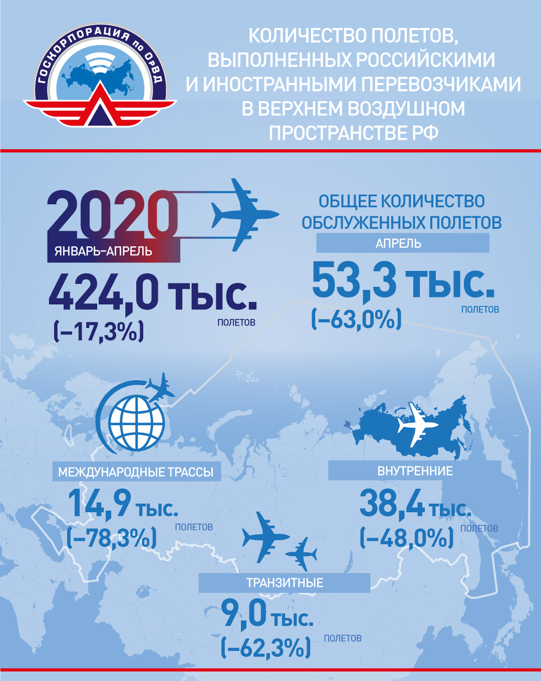 Всего за январь – апрель 2020 российские авиадиспетчеры обслужили 424 тыс. полётов (-17,3 %).