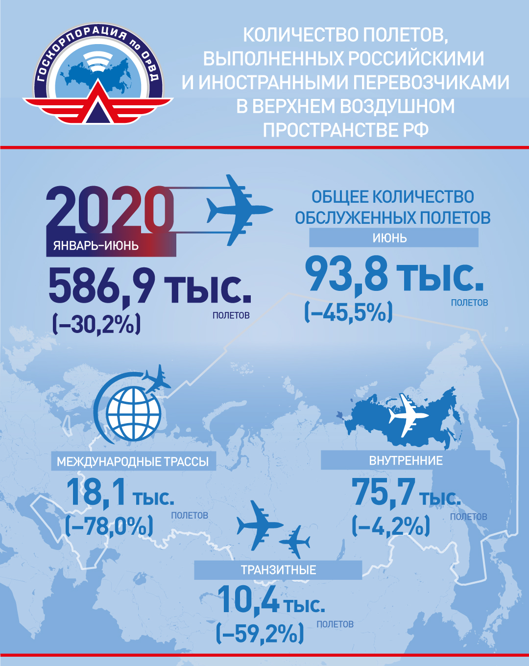 В июне 2020 года российские авиадиспетчеры обслужили в верхнем воздушном пространстве страны 93,8 тыс. полётов, что на -45,5% ниже показателя относительно того же периода прошлого года.
