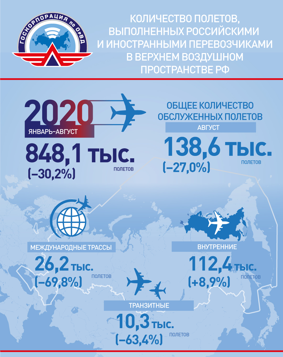 В августе 2020 года российские авиадиспетчеры обслужили в верхнем воздушном пространстве страны 138,6 тыс. полётов, что на -27% ниже показателя относительно того же периода прошлого года.