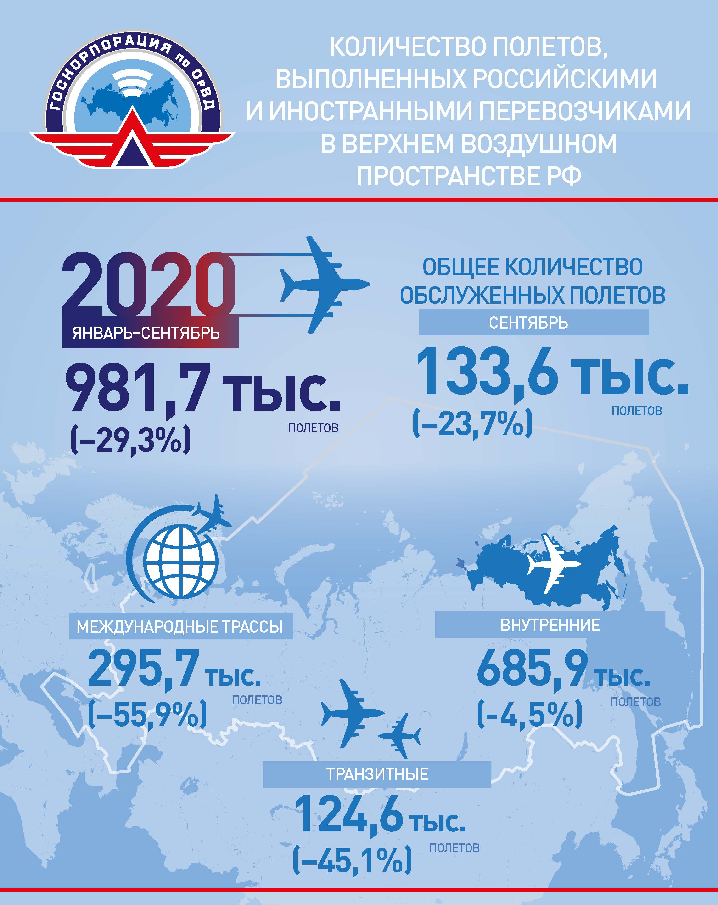 Всего за девять  месяцев 2020 российские авиадиспетчеры обслужили 981,7 тыс. полётов (-29,3 %). На международных воздушных линиях выполнено 295,7 тыс. полётов (-55,9%), включая 124,6 тыс. транзитных полётов (-45,1%). Число внутренних полётов составило 685,9 тыс. (-4,5%).