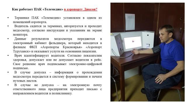Ранее, в 2018 году, ФКП «Аэропорты Красноярья», с целью организации деятельности аэропорта Диксон и в связи с отсутствием на острове больниц и медицинского персонала для проведения предрейсового и послерейсового медосмотра водителей внедрена автоматическая компьютерная система медосвидетельствования. Также ФКП получена лицензия на осуществление медицинской деятельности в части предрейсовых осмотров водителей и согласование Минздрава о применении ТЕЛЕМЕДИКА на Диксоне.