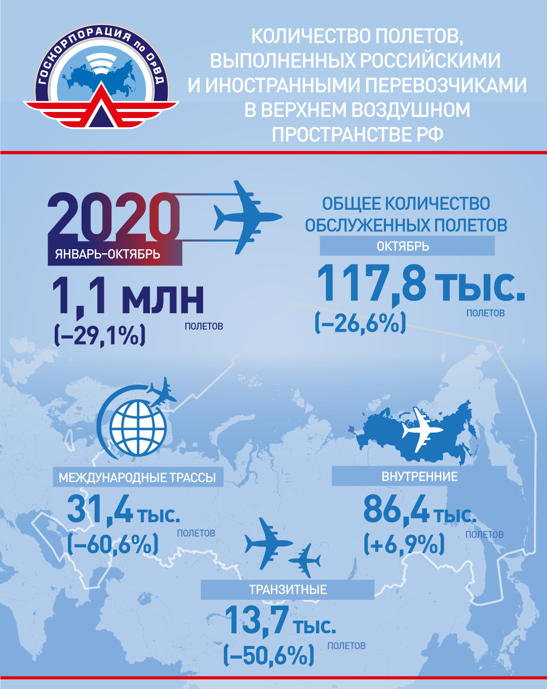 В октябре 2020 года российские авиадиспетчеры обслужили в верхнем воздушном пространстве страны 117,8 тыс. полётов, что на -26,6% ниже показателя относительно того же периода прошлого года. При этом отмечается рост числа внутренних полётов – 86,4 тыс.полетов (+6,9%).