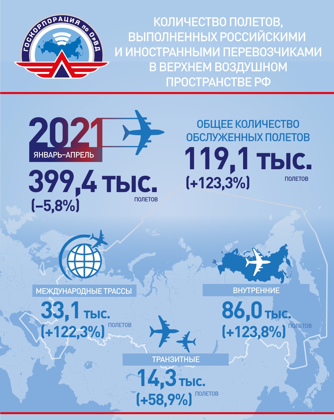В апреле 2021 года российские авиадиспетчеры обслужили в верхнем воздушном пространстве страны 119,1 тыс. полётов, что на +123% больше показателя относительно того же периода прошлого года. Статистические данные за апрель 2020 фиксировали снижение интенсивности использования воздушного пространства РФ на фоне введенных ограничений  в связи с предупреждением распространения коронавирусной инфекции.