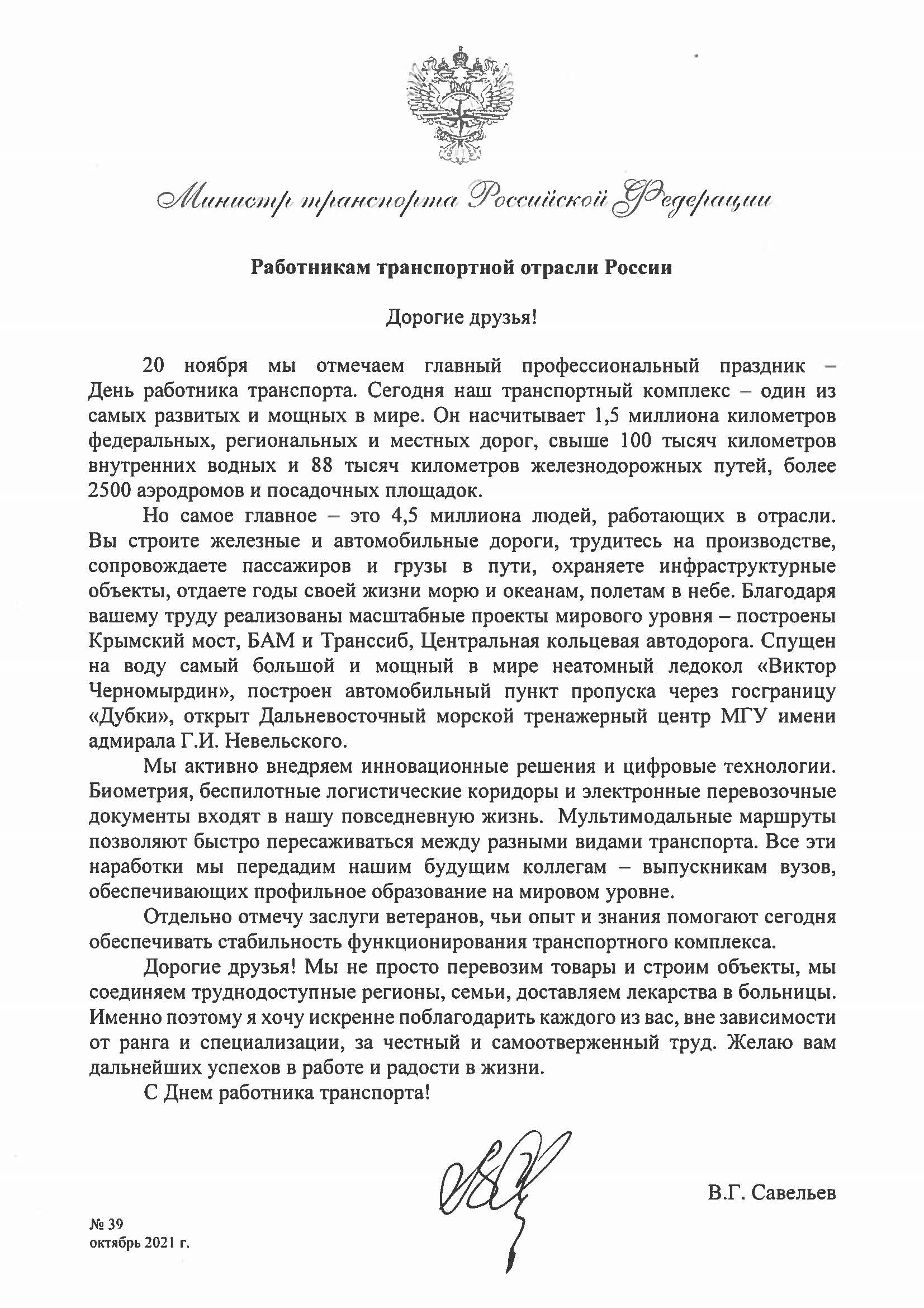 Поздравление Министра транспорта Виталия Савельева работникам и ветеранам транспортной отрасли
