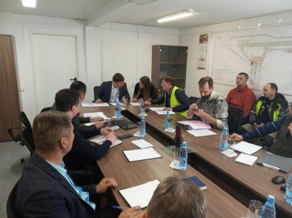 Перед совещанием осуществлен осмотр строящихся объектов. В настоящее время ведутся строительно-монтажные работы на локальных объектах. В здании аварийно-спасательной станции завершаются работы по монтажу стеновых панелей и по устройству внутренних стен. На участке склада ГСМ ведутся работы по отделке зданий административно-бытового корпуса и производственного корпуса.