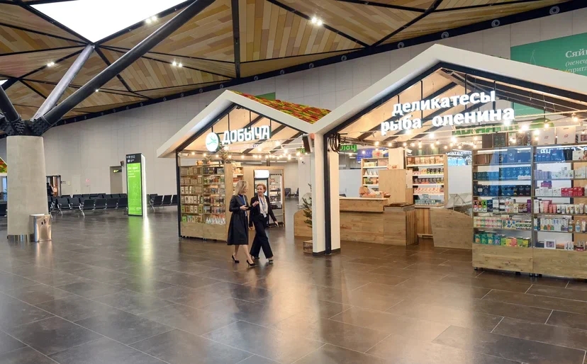 Внешний вид терминала напоминает традиционное жилище коренных народов севера – чум. Внутри размещена постоянно действующая экспозиция, посвященная Ямалу как месту уникальной природы, ресурсов и истории. Одна из инсталляций – «Самоцветы Ямала»: четыре специальные пятиугольные зоны в полу выложены полудрагоценными и поделочными камнями, добытыми в ЯНАО.