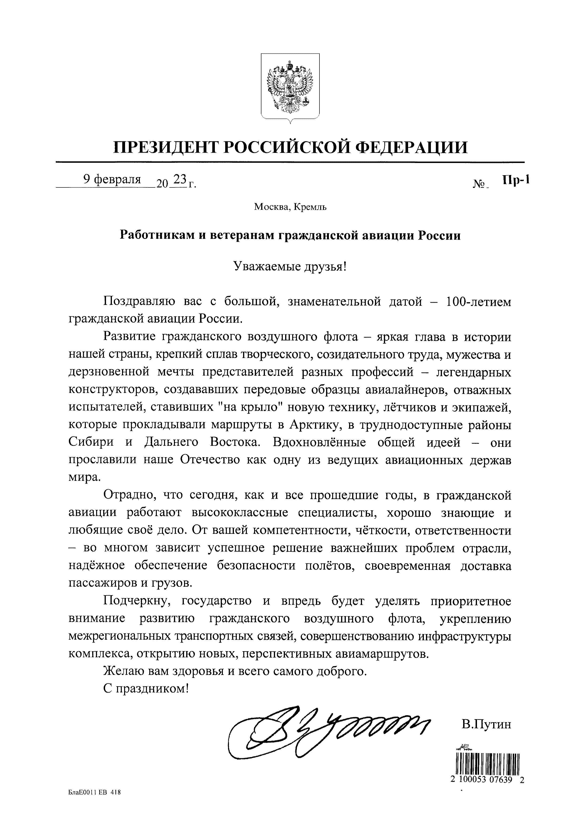 Поздравление Председателя Правительства Российской Федерации М.В. Мишустина работникам и ветеранам гражданской авиации