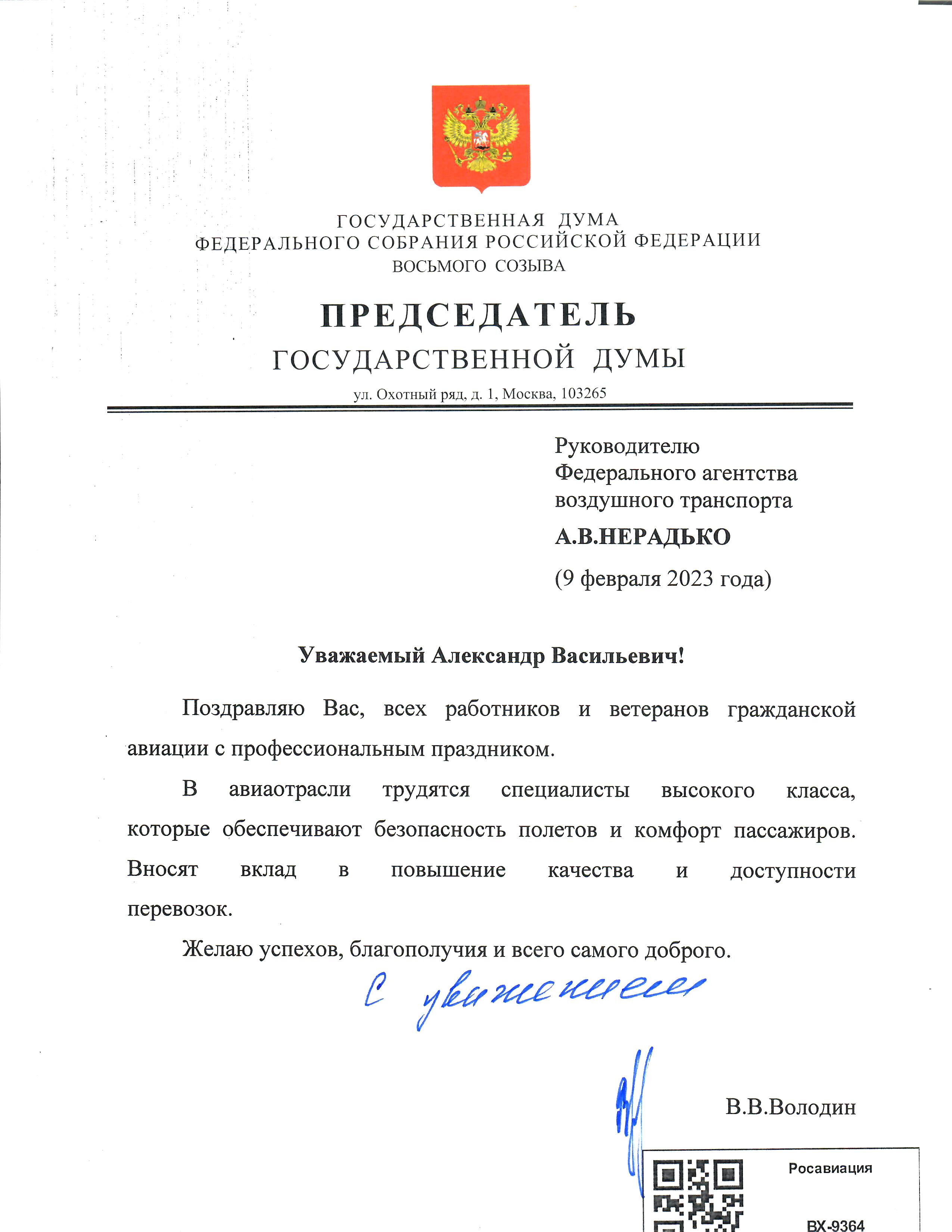 Поздравление Председателя Государственной Думы Федерального Собрания Российской Федерации В.В.Володина работникам и ветеранам гражданской авиации