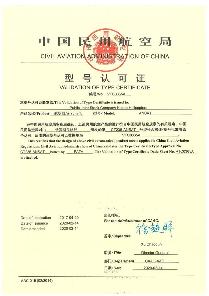 Выдача валидированного Сертификата типа вертолёта АНСАТ (№ VTC0365A) состоялась 14 февраля 2020 года по завершении работ в Китае, совместно проведенных Росавиацией и Управлением гражданской авиации Китая (CAAC) c участием ПАО «Казанский вертолетный завод» в период с 2018 года.