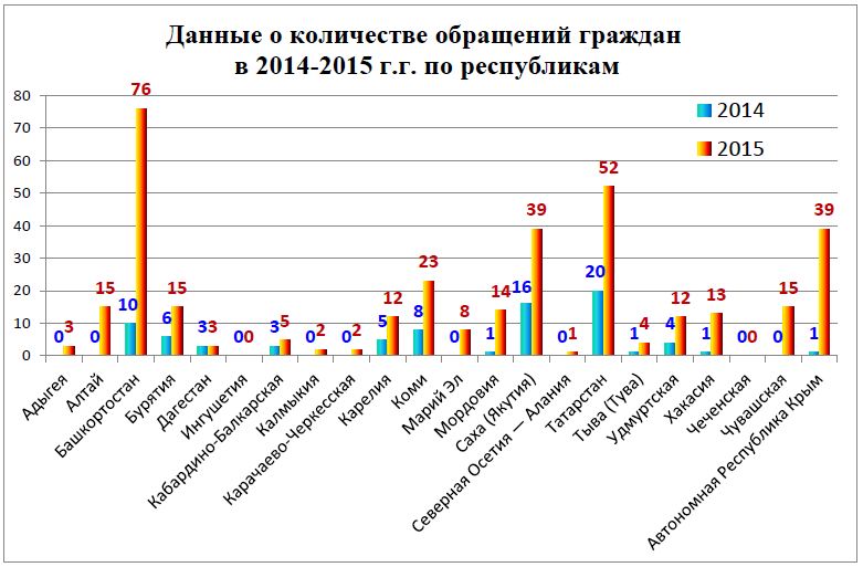 Анализ данных обращений граждан в 2014 – 2015 годах свидетельствует о том, что их количество по субъектам практически не изменилось, за исключением Республик: Башкортостан, где количество обращений граждан увеличилось в 7,6 раза;