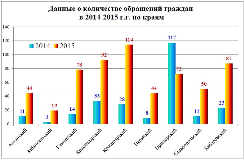 Анализ обращений граждан, проживающих в данных субъектах Российской Федерации, показывает, что в 2015 году по сравнению с 2014 годом количество обращений, поступивших из Забайкальского края, увеличилось в 9,5 раз;