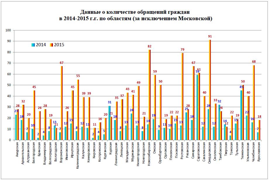 Анализ обращений граждан, проживающих в данных субъектах Российской Федерации, показывает, что в 2015 году по сравнению с 2014 годом значительно увеличилось количество обращений от жителей: Брянской области в 13 раз (с 2 до 26), Владимирской области в 7 раз (с 4 до 28), Воронежской области в 9,5 раз (с 7 до 67), Ростовской области в 6 раз (с 13 до 79).