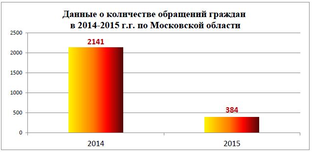 В 2015 году количество обращений граждан, проживающих на территории Московской области, значительно снизилось по сравнению с 2014 годом в 5,6 раза (с 2 141 обращения до 384).