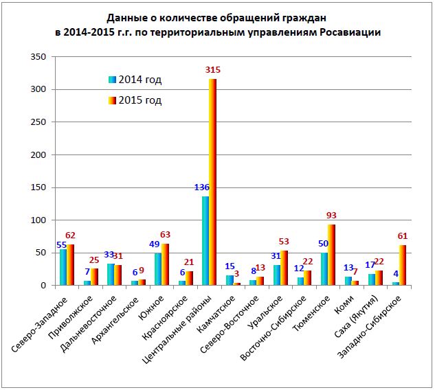 В 2015 году значительно увеличилось количество граждан, обратившихся: в Межрегиональное территориальное управление воздушного транспорта Центральных районов Росавиации – в 2,3 раза (с 136 до 315), в Красноярское межрегиональное территориальное управление воздушного транспорта Росавиации – в 3,5 раза (с 6 до 21), в Приволжское межрегиональное территориальное управление воздушного транспорта Росавиации – в 3,5 раза (с 7 до 25), в Западно-Сибирское межрегиональное территориальное управление воздушного транспорта Росавиации – в 15 раз (с 4 до 61).
