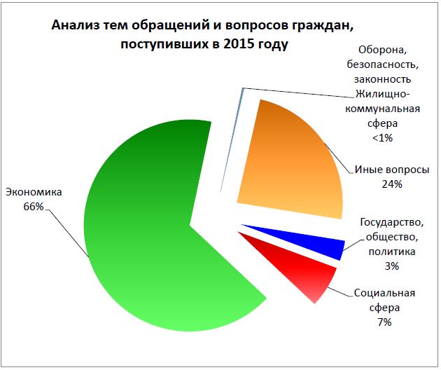 В 2015 году по сравнению с 2014 годом значительно снизилось количество обращений по вопросам: развитие предпринимательской деятельности, малый и средний бизнес (в 31 раз);